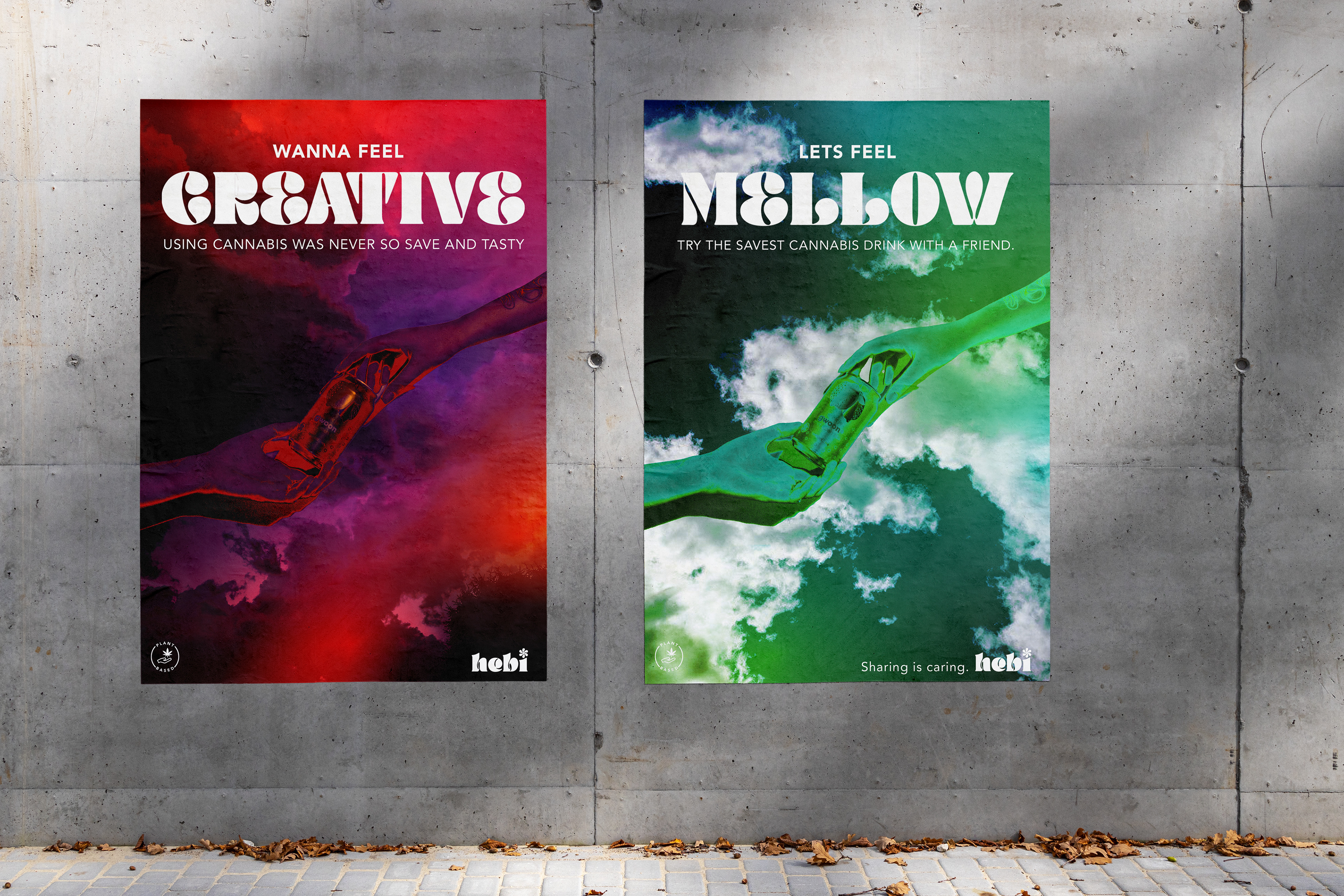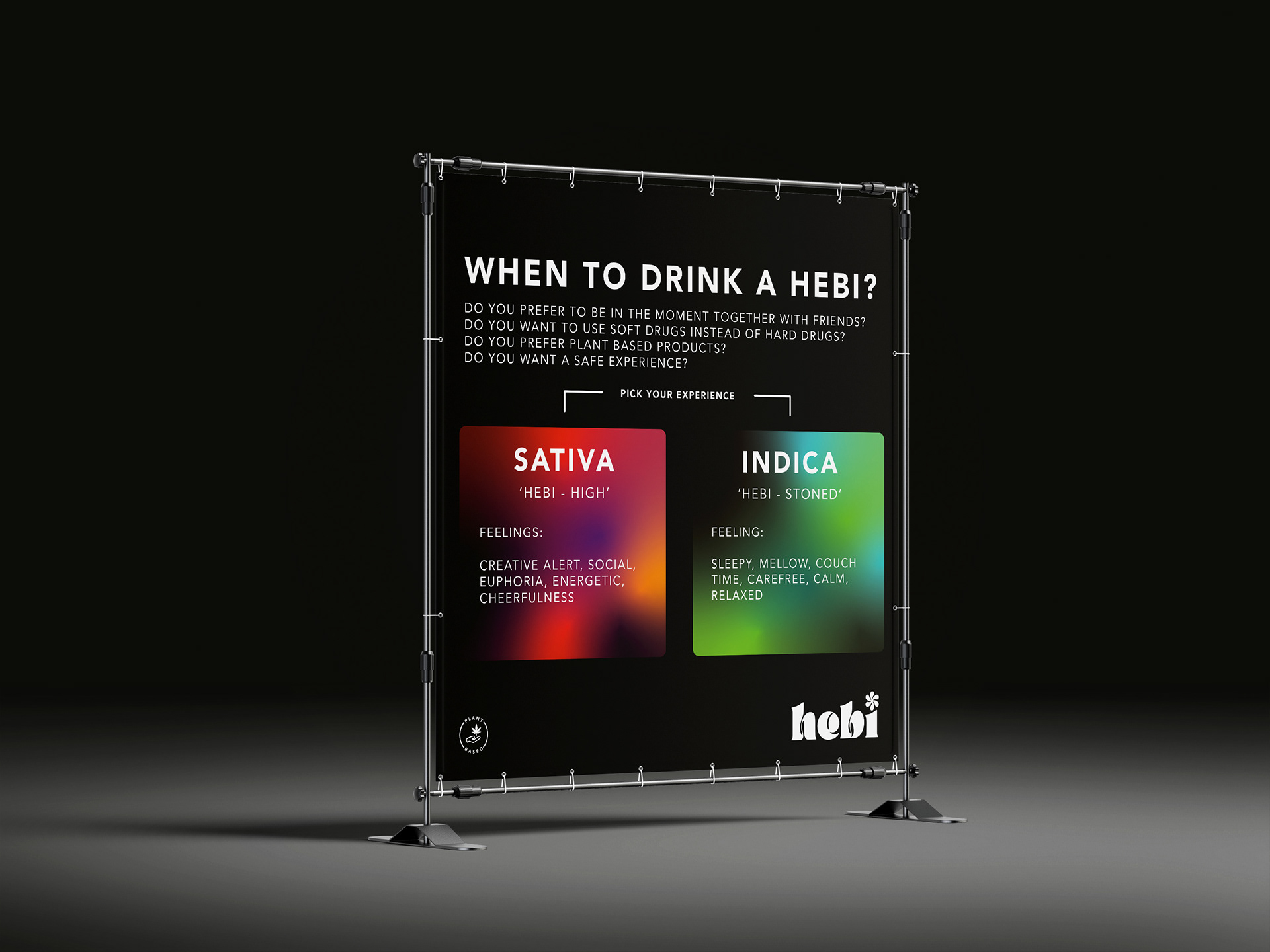 Voor mijn branding-specialisatie werkte ik aan een fictief merk dat totaal out-of-the-box moest zijn. Dat leidde tot Hebi — een plantaardig, alcohol alternatief voor een alcoholisch drankje. Hoe? met een microdosering cannabis. Een nieuw beleving die dosering en duurzaamheid voorop houden